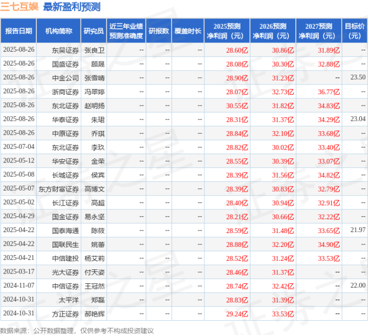 中国银河证券股份有限公司岳铮,祁天睿近期对三七互娱进行研究并发布了研究报告《2025中报业绩点评:新游上线表现亮眼,费用端控制推动利润释放》,给予三七互娱买入评级。